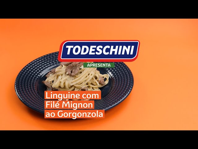 Macarrão TODESCHINI Com Ovos Linguine com molho de queijo gorgonzola e creme de leite e filé mignon em tiras.