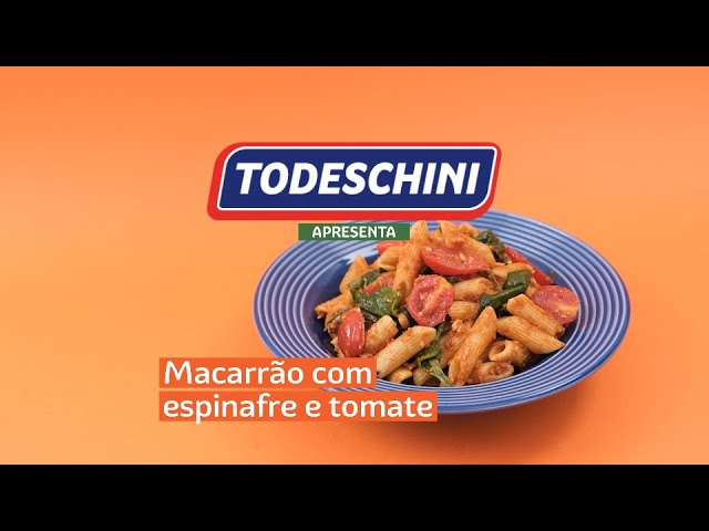 Macarrão Todeschini de Sêmola Pena com folhas de espinafre e tomate-cereja. Finalize com parmesão.