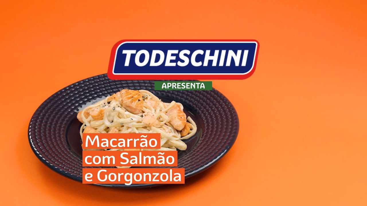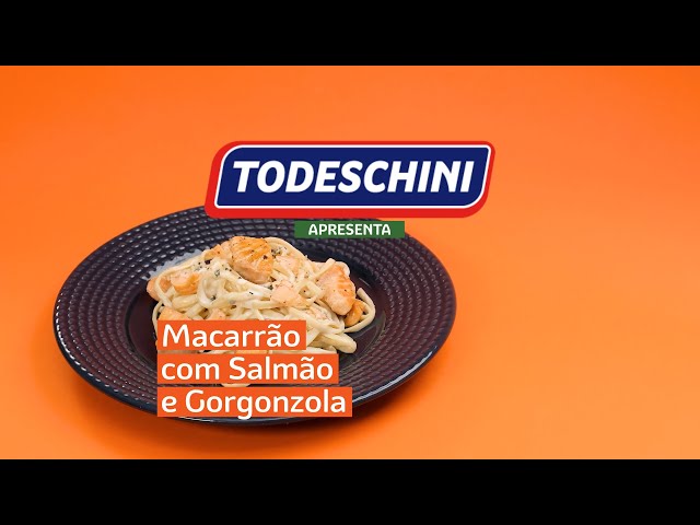 Macarrão Todeschini com Ovos Linguine com molho cremoso de queijo gorgonzola e salmão grelhado em cubos.