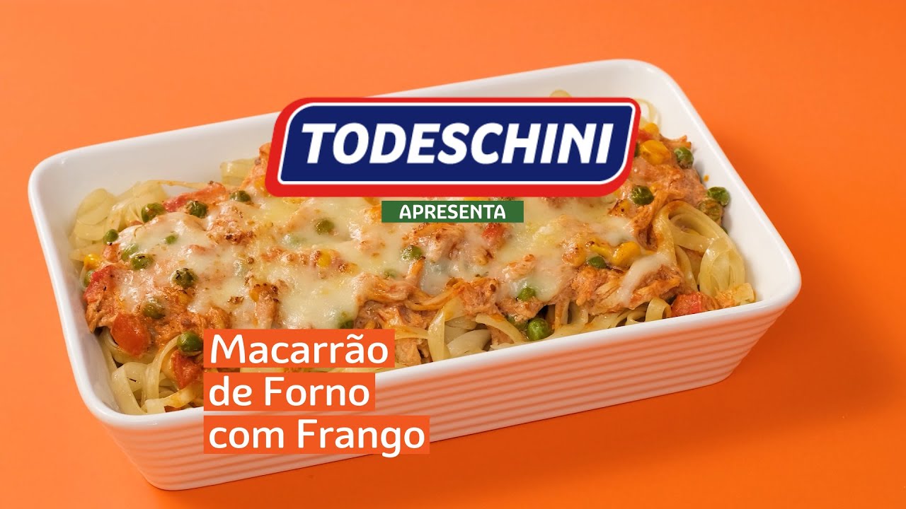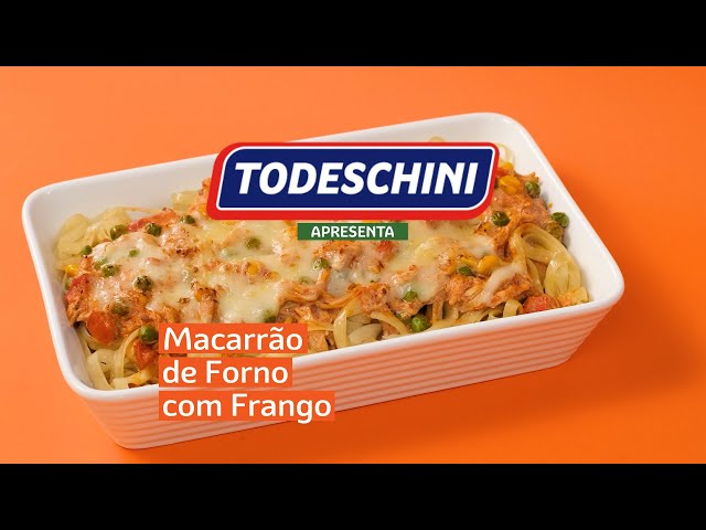 Macarrão Todeschini de forno gratinado com frango desfiado.