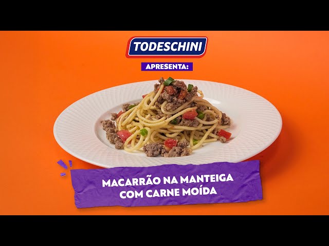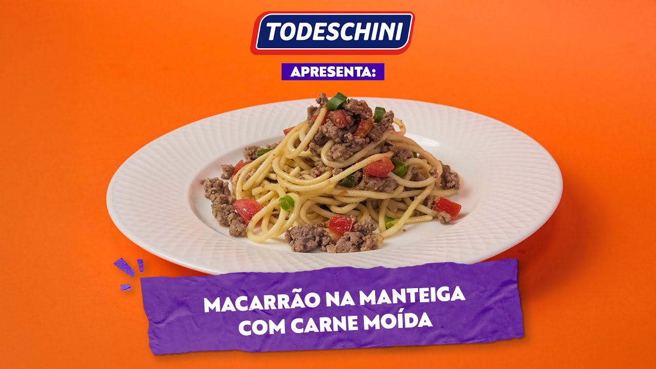 Uma refeição simples e deliciosa, com Macarrão Todeschini Furadinho servido com um molho cremoso de carne moída refogada com cebola, tomate e temperos.