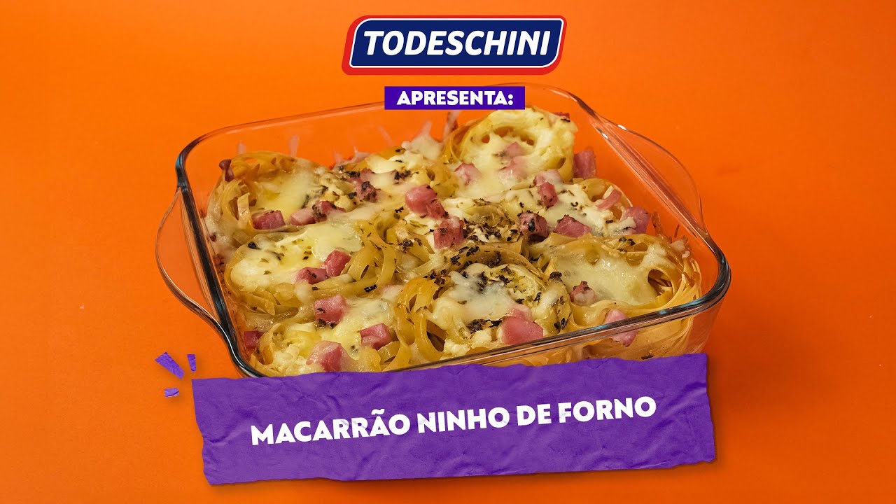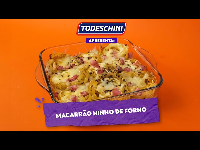 Uma combinação irresistível de macarrão Todeschini Fettuccini Ninhos, molho de tomate, requeijão cremoso, presunto e queijo muçarela. Em apenas 35 minutos, você terá um prato prático e delicioso para até 4 pessoas.