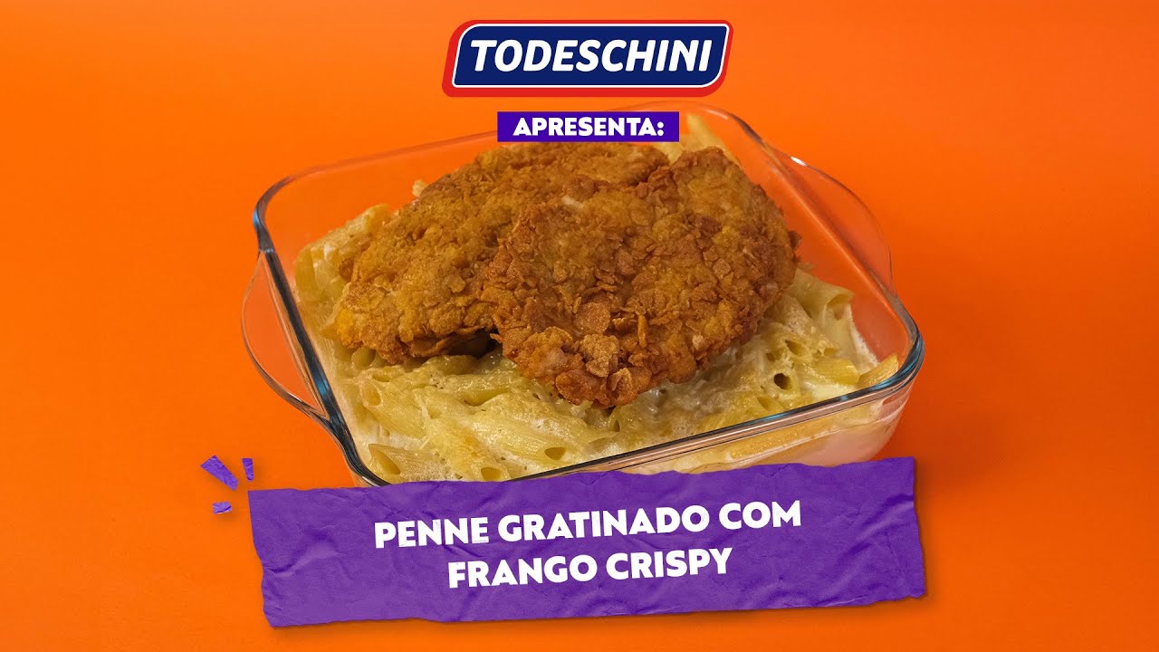Uma deliciosa combinação de penne cremoso gratinado com um toque de queijo parmesão, acompanhado de filés de frango crocantes empanados em corn flakes.