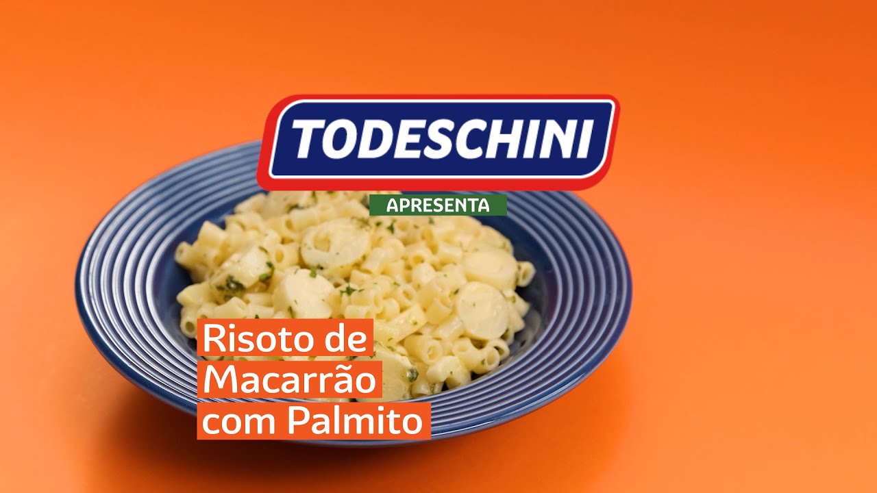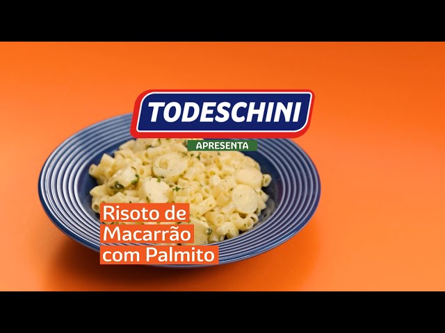 Risotto feito a base de Macarrão TODESCHINI com Ovos Ave Maria no caldo de legumes, recheado de pallmito e finalizado com queijo parmesão.