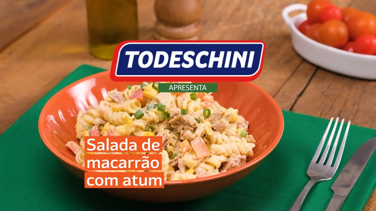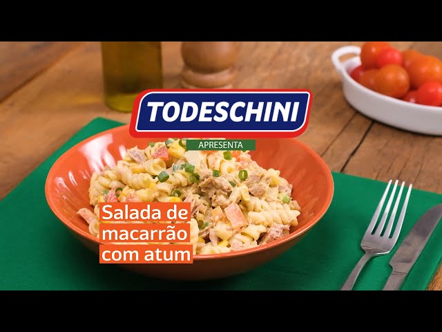 Com atum, milho-verde e tomate, essa é uma receita feita com Macarrão Todeschini parafuso e para servir com salada verde.