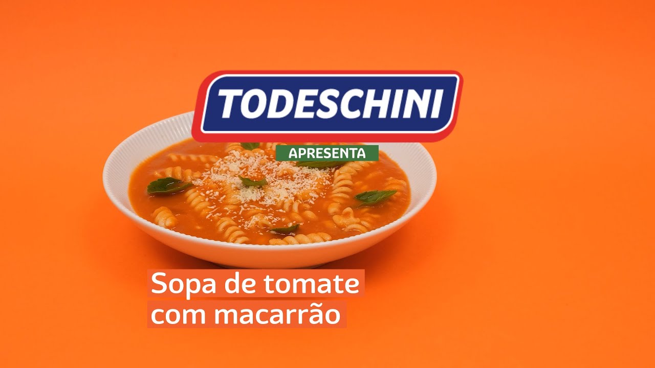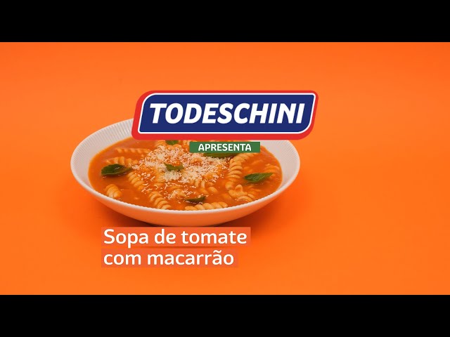 Receita de sopa de tomate com Macarrão Com Ovos TODESCHINI Parafuso, finalizada com queijo parmesão.
