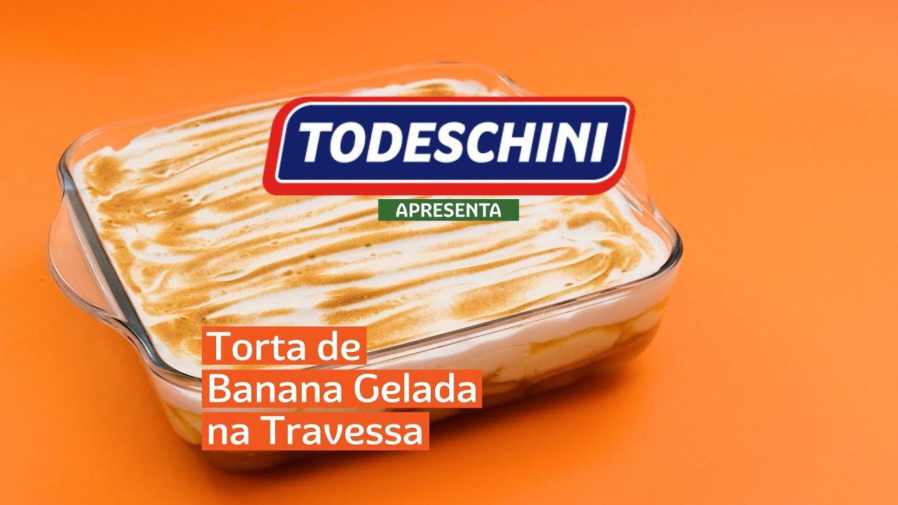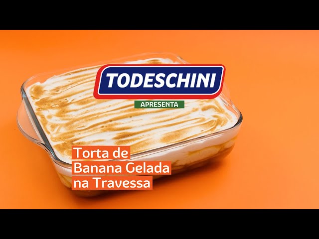 Torta de doce de banana, intercalado com creme branco, Biscoito TODESCHINI sabor Leite e cobertura de claras em neve com açúcar.