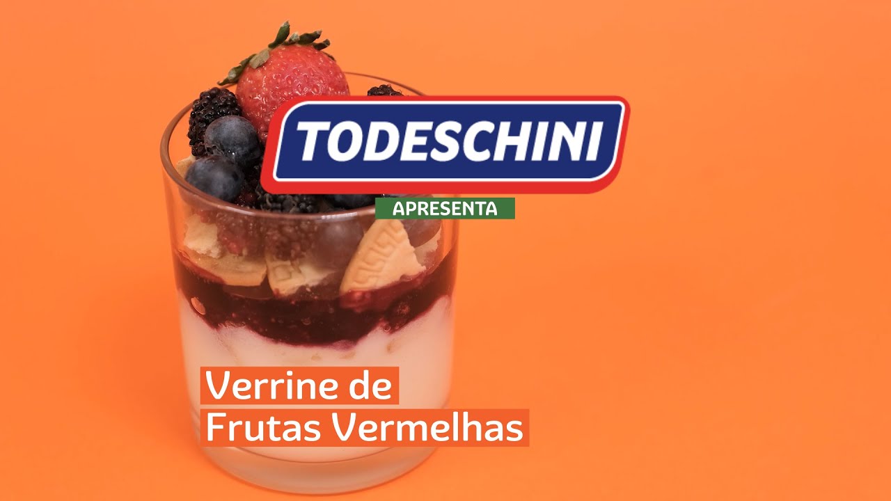 Sobremesa gelada e leve, com Biscoito Todeschini Maria entre camadas de creme branco com leite condensado, leite de coco e iogurte natural, e cobertura de geleia de frutas vermelhas.